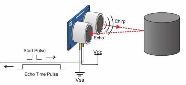 El sensor ultrasónico funciona mediante el envío de un pulso ultrasónico corto, y midiendo el tiempo que tarda en recibir un "Eco" nuevo. Cuanto menor sea la cantidad de tiempo, más cerca el objeto.
