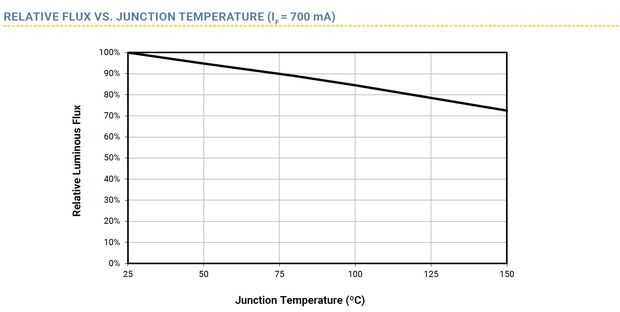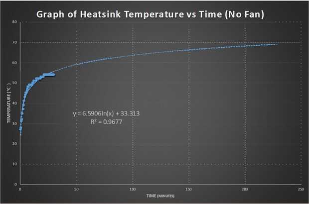 Para la prueba de esfuerzo, os adjunto un termómetro de termopar de tipo k para el disipador de calor en la unidad primaria de LED. Luego utiliza un temporizador y registran los valores de temperatura. Una línea de tendencia fue producida a partir de los datos de 30 minutos y fue extrapolada a 4 horas. Como se puede ver en el gráfico (imagen), el mejor ajuste a los valores era una curva logarítmica. La ecuación tiene un buen valor de R cuadrado (era un buen ajuste) y como pueden ver, si se utiliza la linterna durante un largo periodo de tiempo, la temperatura predicha valores mesetas alrededor de 70 grados. Que no es malo, teniendo en cuenta que el disipador de calor pasivo sólo es deshacerse de calor mediante convección y radiación. Como se puede ver en la imagen de la hoja de datos de CREE, en 70 grados incluso sin el ventilador, el LED dará más del 90% de su capacidad.