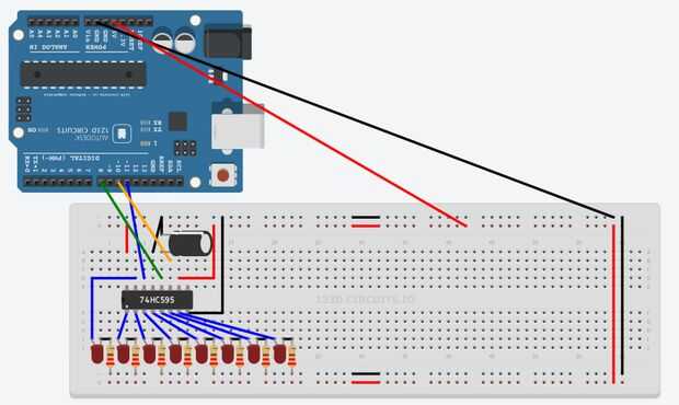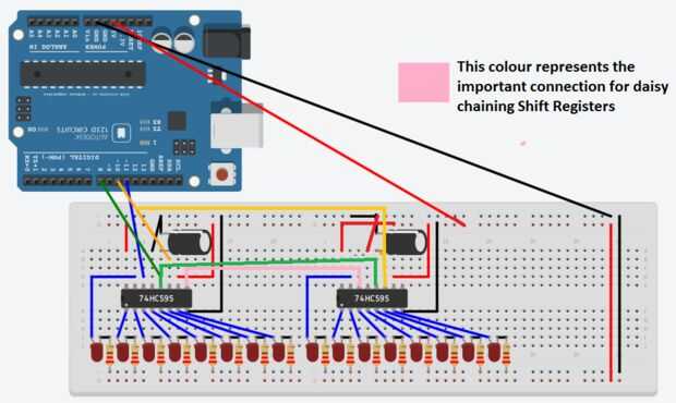 Los registros de desplazamiento se puede aumentar conectando el QH' pin con el segundo turno registra serie (PIN 14). Así el número de salida se limita sólo al número de registros de cambio que se pueden conectar. Registra el código que se proporciona con la opción de conectar hasta 40 +. También he proporcionado un esquema de tiempo real del módulo y las conexiones a la arduino usando los módulos.