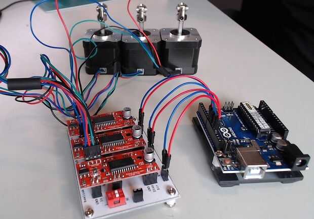 Por ahora, se realizan Conectando Arduino a los tableros de EasyDriver y controlar los motores paso a paso utilizando el bosquejo que he añadido aquí. El bosquejo simplemente cada uno de los ejes de motor en sentido horario y antihorario, gira repetidamente y está diseñado sólo para probar el circuito general.