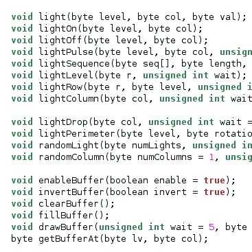 Por último decidí introducir dos características que son útiles para efectos más interesantes. Uno es un buffer que permite las funciones básicas construir patrones más complejos. La otra es una función de secuencia que luces una matriz de LEDs uno por vez o todas a la vez.