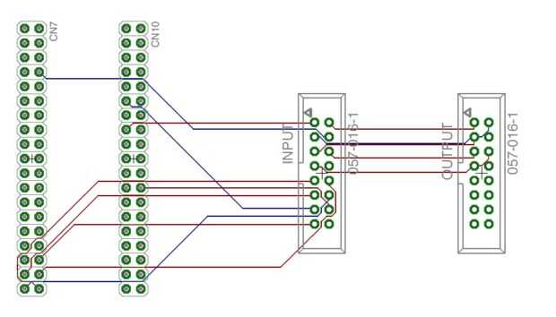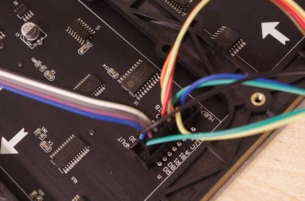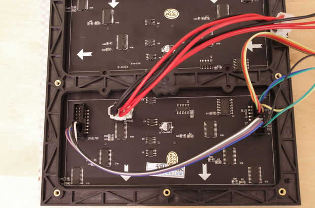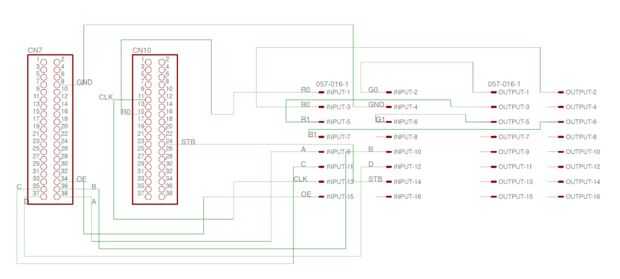 La cabecera con la etiqueta 'INPUT' se utiliza para la selección de datos y la línea de píxeles de la fuente. La cabecera 'OUTPU' puede utilizarse para múltiples de la cadena muestra juntos. Puesto que sólo queremos utilizar un solo cable y los drivers SPI para suministrar datos de pantalla de dos líneas seleccionadas a la vez hay algunos creativos cableado necesario.