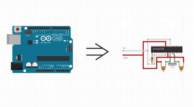 Así que esta s una buena oportunidad para hacer una versión minimalista de la Arduino Uno. Todo lo que necesitas es un microcontrolador ATmega328 (con bootloader de Arduino), un zócalo de 28 pines DIP, un oscilador de cristal de 16 MHz, condensadores de cerámica de dos 22 pF y una resistencia de 1 k. Sólo tienes que seguir el esquema anterior.