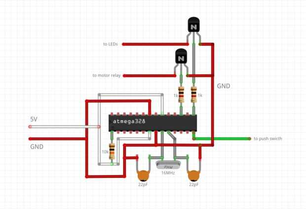 El colector de cada transistor se conectará luego a cada una de nuestras salidas: los LEDs y el relé, que se corresponde a los pines 15 y 17 del microcontrolador ATmega (pines 9 y 11 del Arduino, respectivamente). PIN 14 del microcontrolador (pin 8 de Arduino) estará conectado con el pulsador y será nuestra única entrada, que permitirá al usuario seleccionar el modo de funcionamiento de la lámpara.
