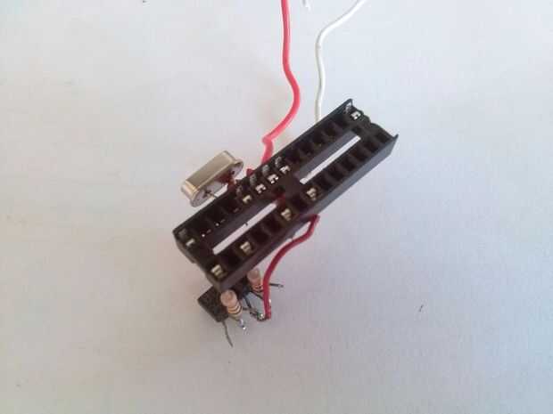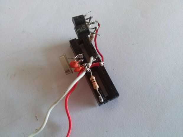 La soldadura de las piezas del circuito en el tomacorriente, sin el microcontrolador en él, para evitar dañarla, ya que son más sensibles al calor. También 2 cables (blanco y rojos en el esquema) a los terminales positivos y negativos, para alimentar el Arduino después de la soldadura.