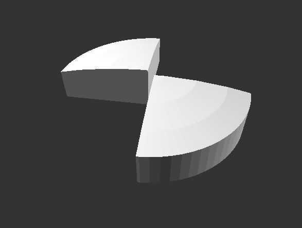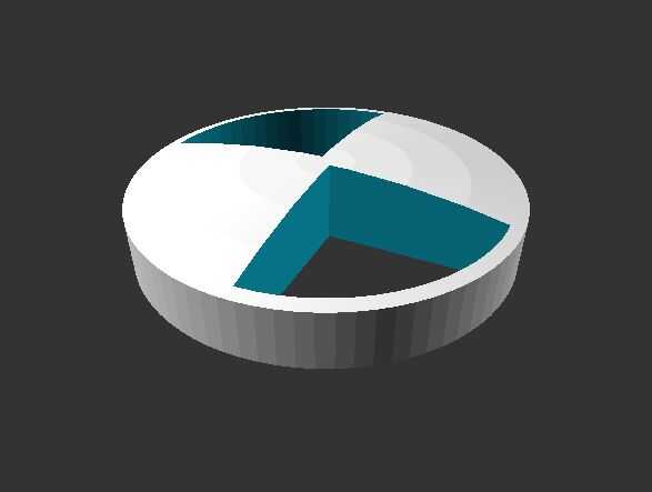A continuación, he creado la parte de blue_inner.scad (tercera imagen). Fue hecha de los misma dos cuartos de un círculo en la parte de white_inner.scad , pero seguí a la intersección con la roundel_main.scad pieza original, con la parte inferior (altura outside_ring.scad) cortada.