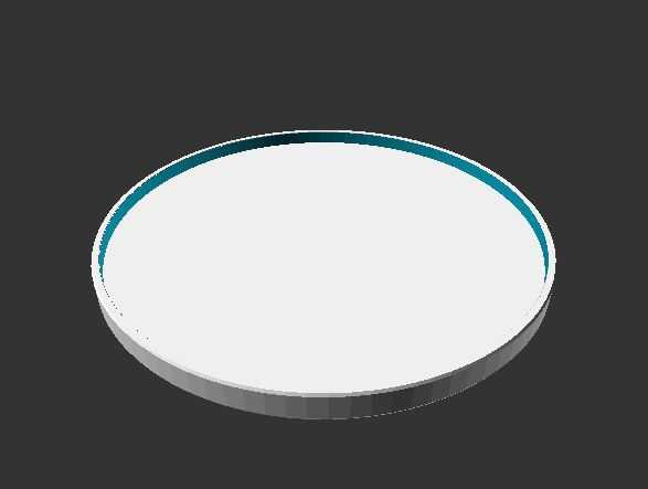 Esta parte era muy fácil de diseñar. Simplemente tomó la parte entera de roundel_main.scad y mantiene sólo la sección inferior y el anillo alrededor de él. Lo hice creando un cilindro que abarca la sección del anillo y otro cilindro que sumió en la mitad del mismo, creando la forma de plato.