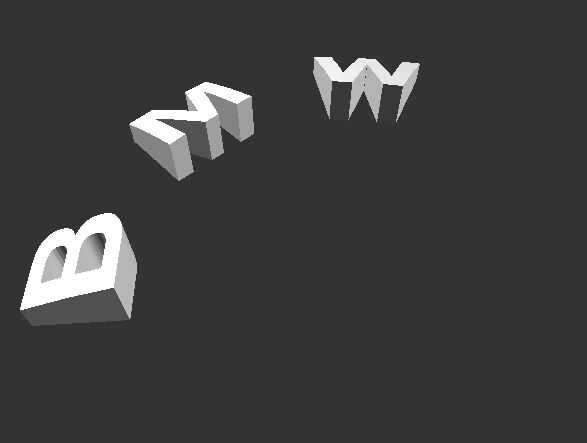 El siguiente fue letters.scad- B, M y W (Cuarta imagen). Estas piezas eran mucho más complicadas de lo que esperaba.