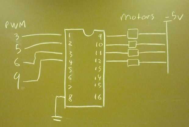 Usted debe comenzar por subir el circuito del pan. Para este paso necesitarás la Arduino, los motores y un par de transistores darlington (como un protoboard y cables). El cableado puede verse arriba, pero debo explicar lo que está sucediendo. Cuatro de las salidas PWM digitales cable (marcados con un ~ en el Arduino) a darlington como se muestra. Las salidas van entonces en los motores, que se conectan a la fuente de energía. Yo empezaría probando con una fuente de alimentación de 5v, pero una 3-5v batería debe estar bien para el resultado final.