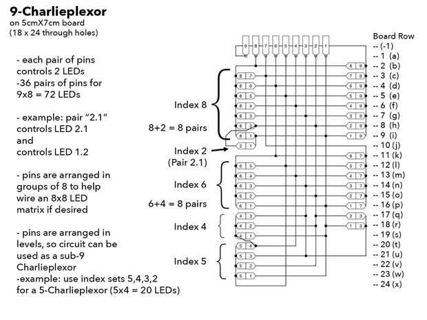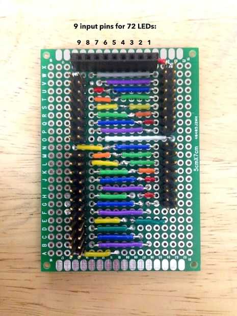 Este Instructable muestra cómo cablear una 9-Charlieplexor. (Formalmente se trata de un "circuito de Charlieplexing con 9 nodos" capaz de controlar 72 LEDs o menos.) Un método general podría tomarse de este diseño para Charlieplexors más grande. Es probable que pondré en un circuito Charlieplexor más grande que yo podría conseguir, pero me detuve en una configuración suficientemente grande para que una matriz de 8 x 8. Esto es porque el cableado que un 9-CP a mano en una matriz no comprimidos ya implica conexiones del circuito de más de un centenar, no mencionar el puente 72 y 72 conexión a los LED ellos mismos. Ya he construido las matrices de LED (en los 3 paneles) y planeo tener una cinta saliendo de cada panel del sub-array para enchufar la placa anterior. Los 72 puentes son bastante rápidos conectar, pero ya es obvio que ~ 24 alambres saliendo de cada panel sería dolorosos para conectar individualmente.
