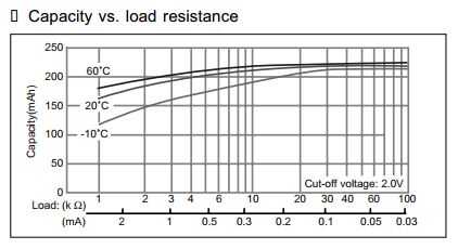 La capacidad de comparación gráfica de resistencia de carga muestra que como es más corriente, disminuye la capacidad de la batería. En la descarga de mA 1, obtenemos ~ 190mAh o 190 horas de vida! En la descarga de mA 2, obtenemos ~ 165mAh o sólo 82,5 horas de vida. Aviso que la disminución no es lineal - es decir, en la descarga 2 de mA no te 190/2 = 95 horas de vida. La corriente inferior que podemos ejecutar en el incluso ya va a durar nuestra batería.