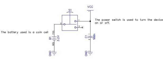 Idealmente, queremos una fuente de energía pequeña y de bajo costo. Elegí una pila de moneda CR2032 litio como un buen compromiso entre tamaño pequeño (20 mm de diámetro), suficiente voltaje (3V) y capacidad (mAh 225). La hoja de datos puede encontrarse aquí. Se incluye el interruptor para poder desconectar la batería del circuito fácilmente.