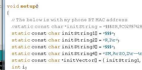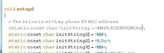 - Modificar la fuente de Arduino para que la línea ' initString en función setup() contiene su dirección MAC de Bluetooth del teléfono