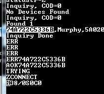 - El módulo responderá con "consulta, COD = 0 entonces debe encontrar su dispositivo y la lista la dirección MAC de tu Bluetooth, nombre simpático de su dispositivo. Ver parte de la ventana del terminal por debajo de un ejemplo