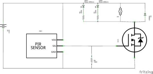 - Los MOSFETs son un poco más complicado (si alguien encuentra un buen recurso de niños, por favor me avisan). Básicamente actúan como una válvula de control electrónico que determina o no corriente puede fluir a través de los LEDs y el motor. La salida del sensor de PIR activa el perno de la puerta de lo MOSFET. Cuando la compuerta recibe un voltaje alto, el MOSFET se enciende, permitiendo que la corriente fluya. Cuando la compuerta recibe un voltaje bajo, el MOSFET se apaga, apague el LED y el motor.