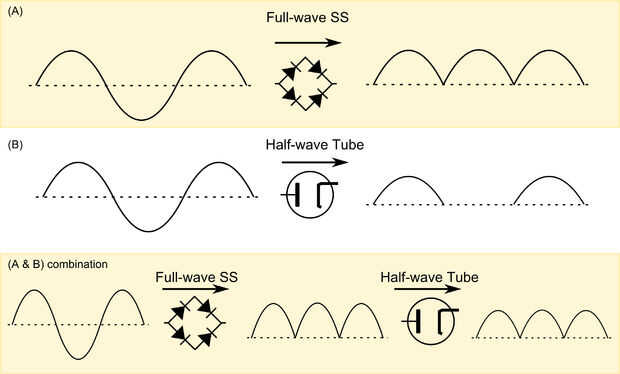 Y tenga en cuenta que la tensión de pico del rectificador de tubo (diodo) es menor que el puente de estado sólido. Tenga en cuenta también que rectificación de media onda necesita no hacer con un diodo de tubo, una función de estado sólido diodo "igual" para esta aplicación.