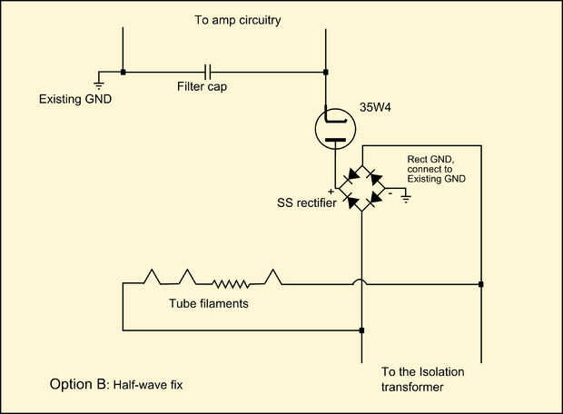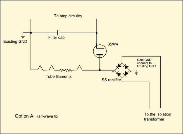 Un transformador de aislamiento más grande podría anular el problema, pero cuando se utiliza el N68X la mejor solución es rectificar dos veces --una vez con un rectificador de estado sólido puente para cambiar de puesto la tensión negativa en positiva; luego rectificar otra vez con el tubo 35W4. Eliminará nuestra asimetría, ya que no habrá ningún voltajes negativos para el rectificador de tubo bloquear.