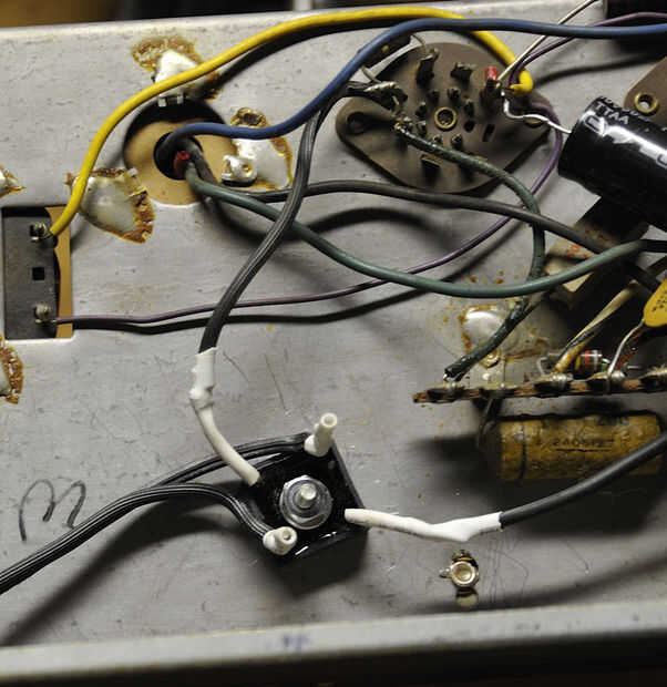 --Todos los filamentos del tubo todavía están conectados en serie, para quitar la 35W4 habría creado un nuevo problema: cómo la gota de la tensión en la secuencia de la serie de filamentos (los dos tubos restantes) por un adicional 35V.