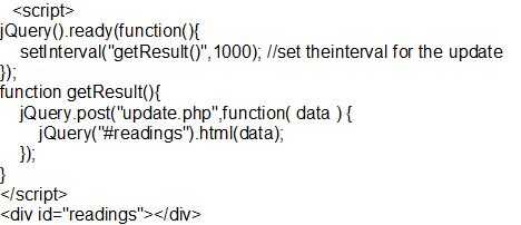 Empecé con el problema de cómo actualizar la información de la base de datos de MySQL primero. Después de que algunos la investigación, ensayo y error determinó que la mejor manera de hacerlo es poner mis scripts PHP en un documento separado de PHP entonces actualizar el documento con el comando de actualización meta. Esta continuamente actualiza los datos! Entonces encontré un script jQuery que sería actualizar cualquier cosa dentro de un tag html "div o span". Luego pongo los dos juntos y "wala" datos refrescante sin refrescar la página entera y el contenido!!!!
