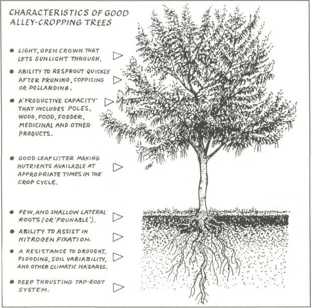 Como se muestra en los diagramas anteriores, hay un número de diversas características que puede estar buscando en un sistema agroforestal. Algunas cualidades útiles y populares sobre árboles más altos y leñosos que son fijadoras de nitrógeno (es decir que vuelva a colocar nitrógeno en el suelo), pueden proporcionar sombra plantas a menos que no les gusta sol de día, y algunos pueden funcionar como rompe viento. Si el escurrimiento del suelo es un gran problema en su área, o si es un clima muy ventoso, considerar las cualidades de estas plantas para el policultivo. Por el contrario, cultivos tales como maíz nitrógeno del suelo, así que puede ser una buena idea asociar este cultivo con una planta leñosa que no proporciona demasiada sombra, como el maíz pueden manejar plena luz solar. Estas son sólo algunas ideas de diferentes plantas le ofrecen. Para obtener más sugerencias e ideas y para descargar más información sobre especies de plantas, se puede visitar treesforthefuture.org.