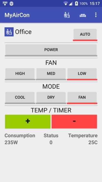 Aircons diferentes son seleccionados por los botones en la parte superior de la barra, mostrando los iconos para la oficina (FujiDenzo aire acondicionado) y salón (aire acondicionado de Carrier). Si se encuentran más de 2 controladores de aire acondicionado de ESP8266, se enumeran en el menú (icono de derecha en la barra superior).