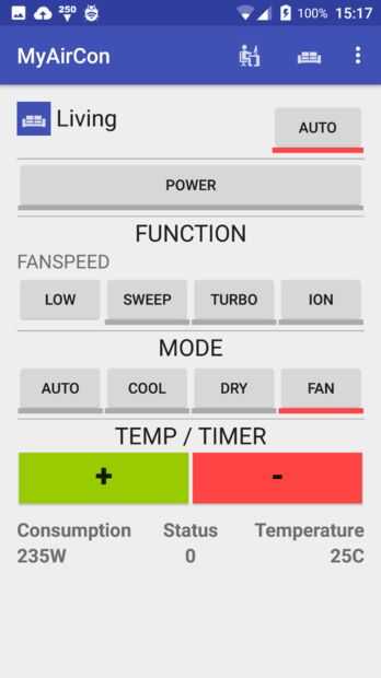 He creado este apk Android para tener control de mi aircons con la ayuda de los módulos de control remotos de aire acondicionado de ESP8266. Esta aplicación se puede ejecutar en varios teléfonos y tabletas en paralelo sin problemas, como el último estado del aire acondicionado (o mejor del módulo ESP8266 que es controlarlo) es conocido por todos los dispositivos.