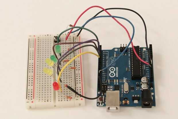 - enchufe 5 puentes de pines digitales 2-6 en Arduino para piernas más largas de LED en protoboard