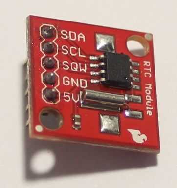 El módulo RTC utiliza la interfaz I2C de alambre para comunicarse con Arduino en A4 y A5. La línea de datos (SDA) está en A4, y la línea de reloj (SCL) está en A5. Con la batería en el módulo, el RTC puede funcionar por hasta 17 años sin una fuente externa de energía. La ficha técnica recomienda el uso de resistencias pull-up a 5V en las líneas de datos. Para este proyecto ignorar la salida de onda cuadrada (SQW).
