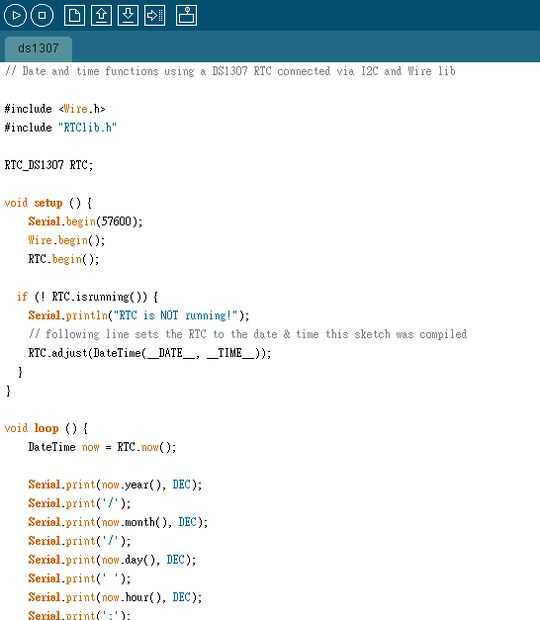 Para programar el tiempo utilicé el código de ejemplo de ladyada de su biblioteca RTC y tutorial. Usted puede conseguir la biblioteca aquí en su página de github. Su código establece la hora con la hora actual en su computadora. Asegúrese de que descomentar esta línea de código: