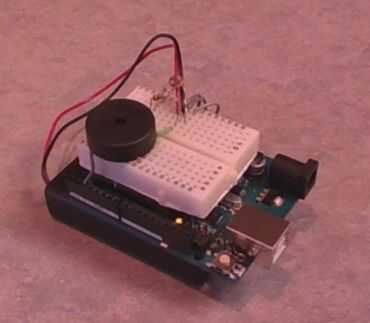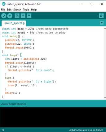 const int dark = 200; //set dark parameters const int sound = 50; //set noise to play void setup() { pinMode(2, OUTPUT); pinMode(A2, INPUT); Serial.begin(9600); } void loop() { int light = analogRead(A2); if (light < dark) { Serial.print(light); Serial.println(" It's dark"); } else { Serial.print(light); Serial.println(" It's light"); tone(2, sound, 10); } delay(10); }