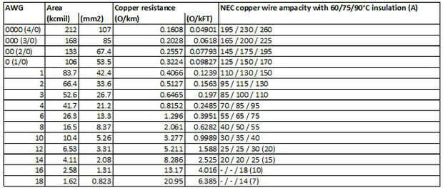Por simplicidad me refiero a la tabla de capacidad de corriente AC para indicar qué conductores de tamaño para usar. Tenga en cuenta que DC ampacidad por el mismo cable es mayor debido a que allí no es ningún efecto piel para DC. Tomemos por ejemplo el cableado en los coches. Para los faros delanteros, alternador, arranque etc. notará la diferencia de área seccional transversal para el amperaje equivalente en un sistema de AC. Utilizando la tabla de AC para el cable de CC tamaño significa que usted tendrá una menor caída de tensión que es buena.