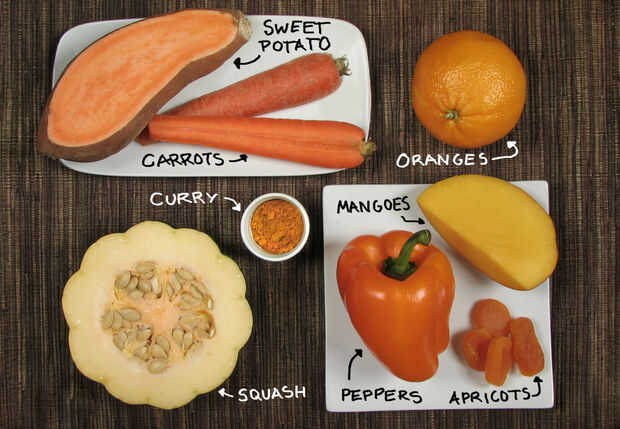 Zanahorias- El homónimo de la familia de carotenoides, las zanahorias suelen tienen un color naranja brillante (aunque las variedades reliquia pueden tener carne púrpura o amarillo). Intenta añadir jugo de zanahoria a salsas o vinagretas en lugar de agua, de un color naranja brillante.