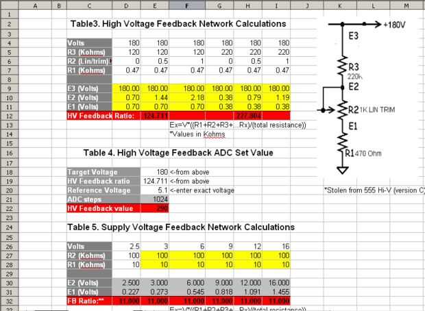 El divisor de voltaje de fuente consiste en un 100K y una resistencia de 10K. Teóricamente la respuesta debe ser igual al voltaje dividido por 11 (véase tabla 5. Fuente de voltaje retroalimentación red cálculos). En la práctica, las resistencias tienen diferentes tolerancias y no son valores exactos. Para encontrar la proporción exacta de la regeneración: