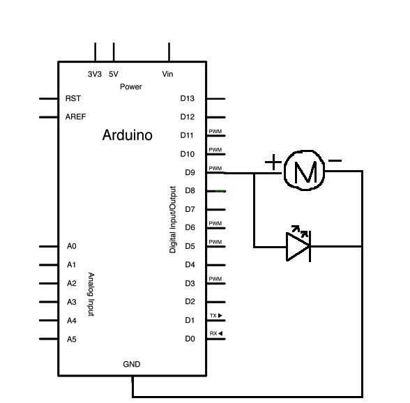 El motor y el LED están cableados en paralelo por lo que reciben las mismas salidas de Arduino para la música. PIN 9 en el Arduino es lo que salidas de la señal de música por lo será el cable para el positivo para el LED y el motor. Ambos conductores el negativo en el LED y el motor serán tierra de goto. Conecte los componentes en un protoboard (o conectado junto directamente si lo desea) después de los cuadros y esquemas.