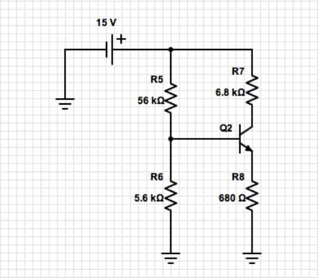 Es importante señalar aquí que ya estamos utilizando un transistor, se puede suponer que todos los actuales saliendo del emisor (1.1 mA) es producida por el colector. Así, si el alambre de una resistencia de 6,8 kΩ entre la fuente de alimentación de 15 V y el colector, veremos ~1.1 mA de funcionamiento actual a través de ese resistor. Esto hace de una caída de tensión de 7.6 V a través de ese resistor, que resta forma nuestra original 15 V es 7,4 V. Este valor de la porción del voltaje de C.C. del voltaje de salida permite la sala máxima para la porción de la AC en.