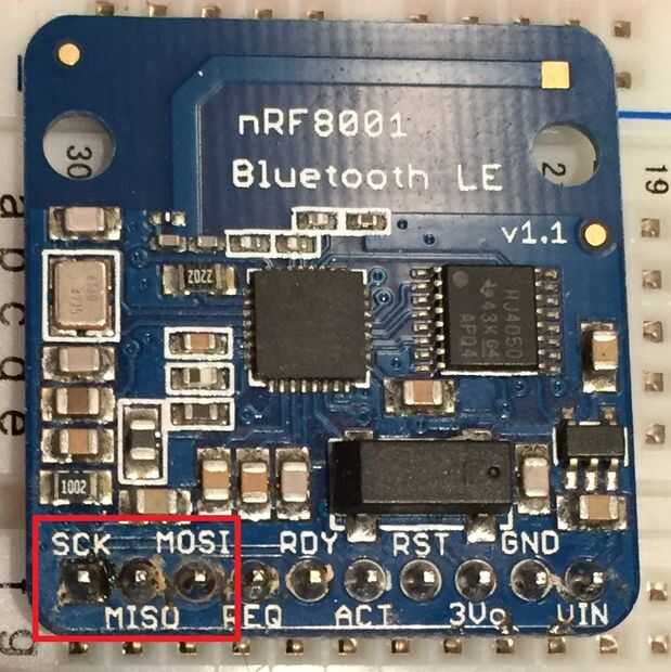 Estos tres pines son importantes porque constituyen una unidad de hardware especial en el Arduino denominado la interfaz periférica Serial SPI. Pin 13 de Arduino es SCK (reloj Serial), MISO 12 (maestro de esclavos hacia fuera) y 11 MOSI (Master a Slave en). El SPI Arduino está conectado a un pin 3 equivalente unidad SPI en el nRF8001. El Arduino se comporta como el maestro y la nRF como el esclavo, aunque los roles pueden invertirse en teoría. El concepto de SPI es muy sencillo. Los clicks de pin SCK hacia arriba y hacia abajo en una plaza regularmente espaciado de la onda (onda cuadrada lo que significa tiene dos valores, altos o bajos). Por cada clic del pin SCK, el esclavo mira en MOSI y figuras hacia fuera si la tensión es alta o baja. El maestro hace lo mismo en el MISO. Si se lee un alto voltaje, es un '1'. Si se lee un bajo voltaje, es un '0'. De esta manera, una secuencia de 1s y 0s es transmitida y traducida a letras, números y comandos, que el software puede entonces actuar sobre. En el caso de los nRF8001, estos traducción Letras y números son transmitidos a través de la conexión Bluetooth con su teléfono. Las letras y números que el nRF8001 envía a tu Arduino son lo recibió desde el teléfono por Bluetooth.