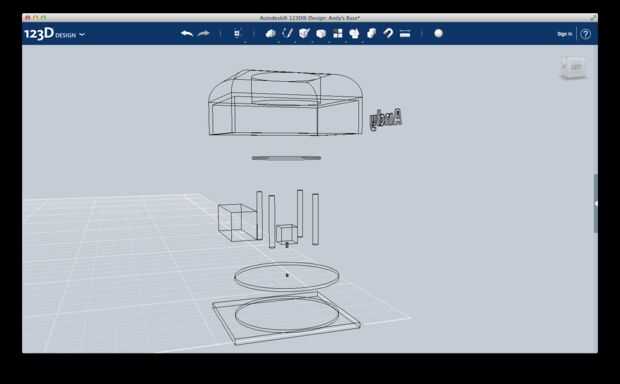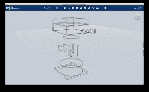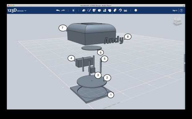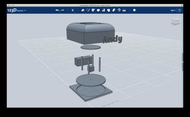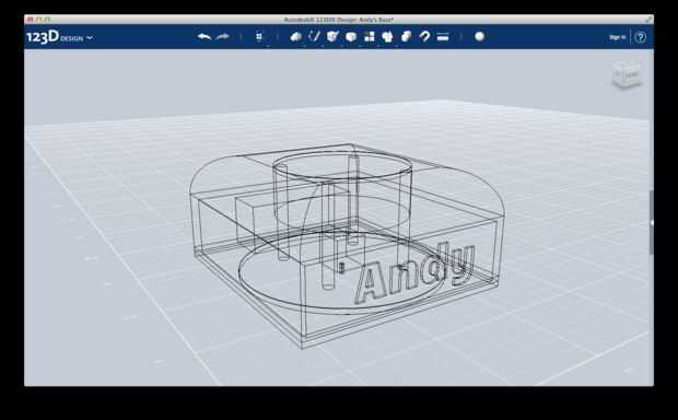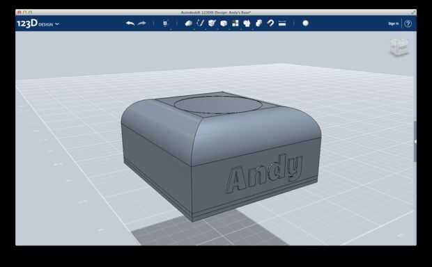 8) el nombre: como cada proyecto respetable, mi brazo necesita un nombre. Abrir el menú de la derecha y seleccione primitivas > Smart primitiva > texto. Cuando el primitivo es carga, cambiar su texto a "Andy". Luego cambiar el tamaño y coloque sobre la cara frontal de la caja.