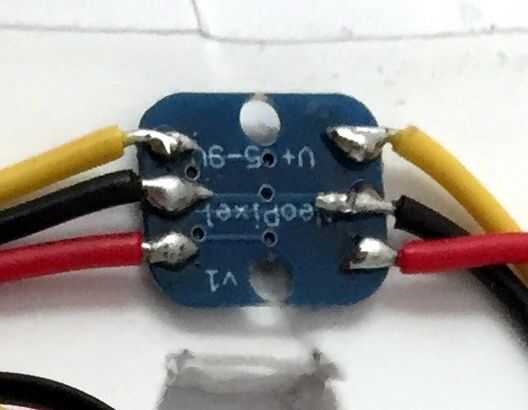Para el primer LED, asegúrese de utilizar los datos en pad - los LEDs tienen una dirección que debes usar. Entrada proviene de Arduino, y salida va a la siguiente LED. Así, para los primeros tres cables, uno de los extremos se conectará con el Arduino - los pueden pelar un poco más - 1/4 y el otro extremo va al primer LED. Después de eso, usted puede soldarlos sólo en una fila - ver las fotos.