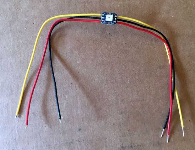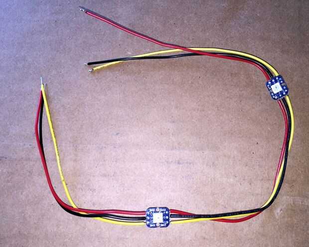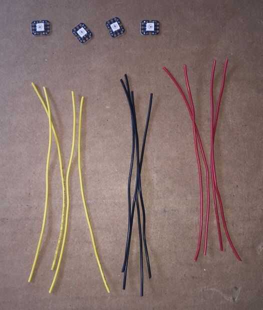 Cable en cada uno de los tres colores de calibre de corte 4" longitudes de la 22 - 4 juegos en todos. Pele los extremos muy cortos para las conexiones del LED - aproximadamente 1/8". Los cables y pastillas de LED primero a hacerles juntas de soldadura de estaño más fácil. Si las pastillas de LED tienen agujeros, puedes saltarlos y a soldar los cables en la parte posterior - encontré más fácil que soldar los cables a través de los agujeros.