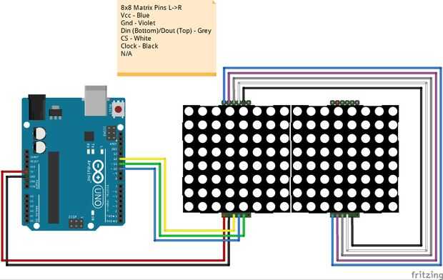 Nota 2: Los visualmente astutos que notará en el diagrama de que la pantalla de 8 x 8 muestra un conector de seis vías. Las utilizadas en este Instructable son 5 manera de hecho. ¿Por qué os preguntaréis? Esto es todo lo que pude encontrar en Fritzing. Sé que voy a tomar algunas críticas de los fanáticos de Fritzing, pero perdió la voluntad de vivir tratando de luchar con el software para crear mi propio parte y dio para arriba en el extremo. Queja sobre. :-)
