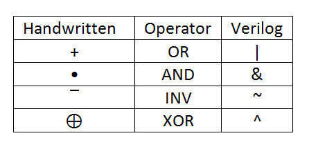 Cuando nosotros escribir ecuaciones de lógica de circuitos digitales, utilizamos un '•' de y, '+' para OR, ⊕ para XOR y si queremos indicar el inverso, o "no" de un término, dibujamos una barra sobre él. Hay equivalentes para todos estos y más en Verilog, como se ve en la tabla adjunta.