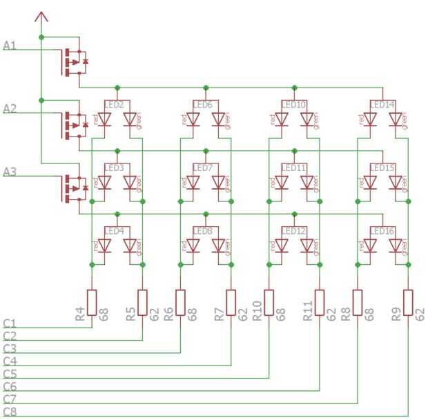 También añadí resistencias limitadoras actuales al final de cada columna. Esto es suficiente, porque sólo una fila en un momento estará activa, por lo que en cualquier momento solo un LED se encenderá de cada columna. Ya que los LEDs verdes y rojo necesitan voltajes diferentes (ver hoja de datos) para llegar a los 20 mA actual, estas resistencias son también ligeramente diferentes para las columnas de rojas y verdes: 62 Ω de la verde y Ω 68 para el rojo.