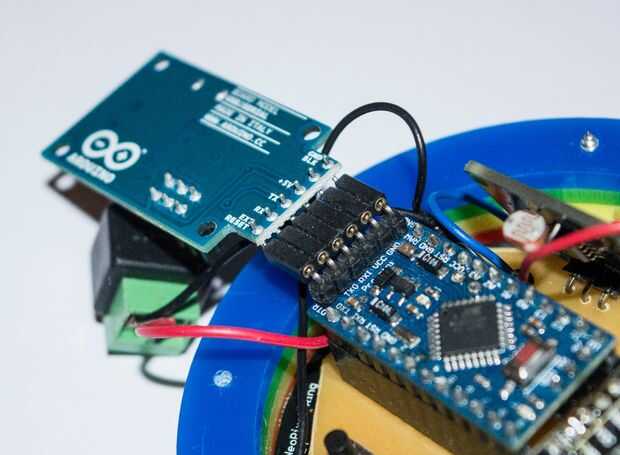 En cuanto a la regulación automática en habitaciones oscuras, el sensor lux mide la luz ambiente cada segundo y si cae por debajo de un valor determinado (que puede cambiar) cambiará el brillo global de los LEDs. El brillo del LED está configurado por un número entre 0 y 255, normalmente lo tengo a 30 durante el día y 1 noche. Pero pronto encontré ese conjunto incluso a 1 fue demasiado brillante para mí a dormir (me gusta la oscuridad total para dormir) así ponerlo a 0. Los LEDs se atenúan hasta que aparecen fuera, pero el reloj sigue la cuenta. También hay un LED montado en el Arduino sí mismo que puede ser lo suficientemente brillante como para confundir el sensor, éste fue superado por que se pega un cuadrado pequeño de cinta aislante sobre el LED.