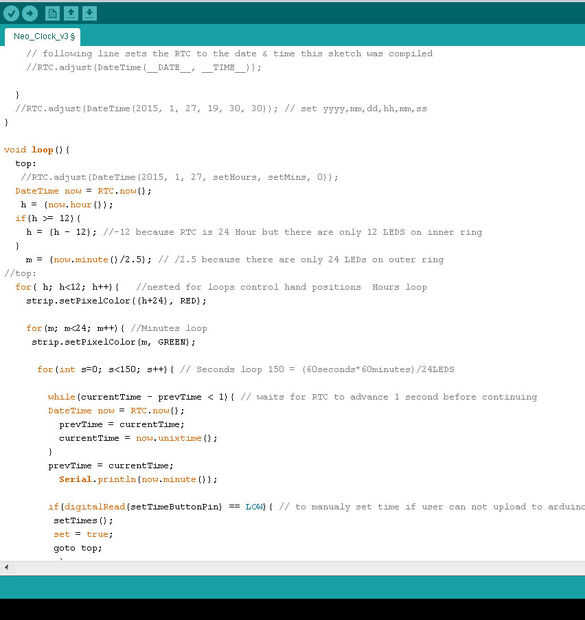 El reloj guarda tiempo por una serie de anidado para bucles. El interior lazo más es responsable de contar a los segundos. Una manera simple de hacer esto es que solo demora de arduino por 1 segundo pero que no va a funcionar para este reloj. Cada segundo y cada 150 segundos (2,5 minutos) hay un corto de animación que toma algún tiempo. Usted podría cuenta para este tiempo y luego simplemente la demora de arduino el resto para hacer el retardo total hasta un segundo, pero de nuevo esto lleva tiempo arrastrarse como el reloj es una fracción de segundo de cada segundo. El funcionamiento de este reloj es comprobando la RTC y simplemente esperar a que ha avanzado por un segundo sin necesidad de utilizar ningún retraso. Una vez más, hay mejores formas de mantener como comprobación de la RTC para toda información de tiempo (horas minutos y segundos) y sólo tiene el pixel neo anillos Mostrar en consecuencia. Si alguien quiere rediseñar el código para que sea más eficiente y preciso entonces estaría feliz de saber de ellos.