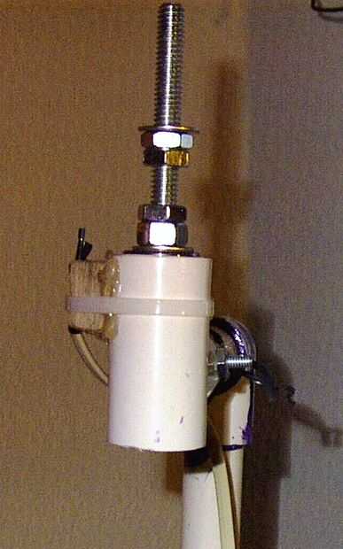 Poner un poco de aceite en el cojinete. Poner el tornillo 5-16 x 3" a través de la parte inferior de la T de PVC y el cojinete. Poner en una pequeña arandela de 5-16 y dos tuercas de 5-16. Apriete la tuerca inferior para que el perno está apretado en el cojinete. Sostener que la tuerca con una llave de tuercas y apriete la tuerca segundo para bloquear los dos juntos. El perno tendrá un poco de juego a causa del rodamiento (ver imagen).