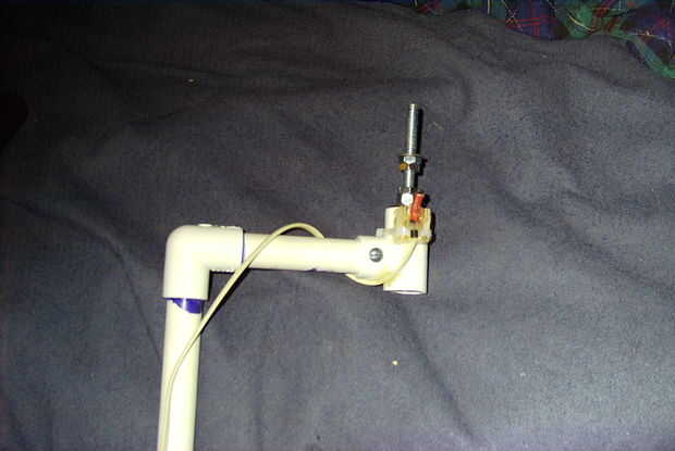 Para facilitar su prueba y uso, hice un conjunto L ½" PVC y pegados juntos. Para unir la T, no pegarla. Taladré un agujero para un perno y tuerca de 8-32 para que el anemómetro puede ser sustituido más fácil (ver imagen).