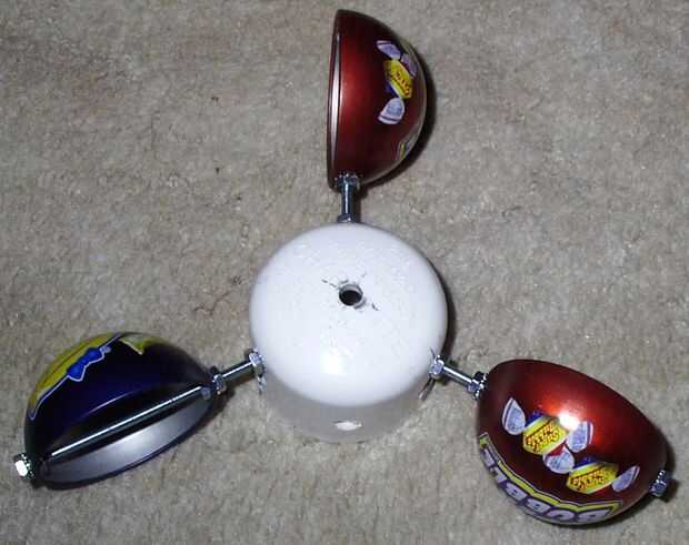 Usé una taza azul que era un color diferente del rojo dos unos. Esto es así es más fácil ver cuando la Asamblea hace una revolución. Utilizando técnicas similares de arriba, marque las tazas de 180 grados a través de unos ¼" desde el borde de los orificios de montaje. Perfore agujeros de 5/32". El metal alrededor del agujero puede deformar un poco con el taladro.