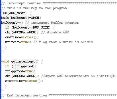 Esencialmente si no disparo está seleccionada, se habilita la interrupción del adc y datos se capturan inmediatamente. Si se selecciona la activación de una interrupción en el puerto digital 2 se utiliza para permitir la interrupción en el puerto 1 del adc.