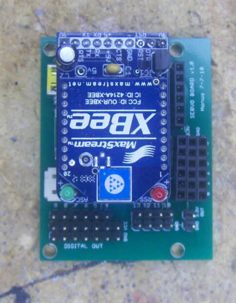 Esto le permite utilizar el control Nunchuck pero no al configurar un controlador como transmisor y otro controlador como el receptor. Utilizar el adaptador inalámbrico Adafruit XBee porque es super fácil de usar y puede trabajar a 3V y 5V por lo que es ideal para cualquier proyecto inalámbrico de Arduino. El tablero servo está configurado para la comunicación punto a punto y el adaptador XBee se conecta directamente a un enchufe en la parte superior de la Junta. Esta configuración sería muy bien para controlar la casa embrujada de interés.