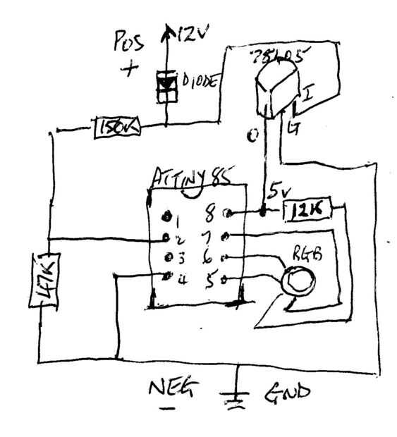 12K resistencia (al ánodo del LED) R pin 7, G pin6, pin B 5